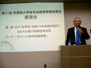 2012.11.23 学校学部:経済学部同窓会 第31回経済学部同窓会総会開催 経済学部同窓会会長 内藤政武氏 平成24年11月20日(火)、学習院創立百周年記念会館にて第31回桜友会経済学部同窓会総会を開催しました。総会では、内藤政武経済学部同窓会会長の開会挨拶に始まり、決算報告、監査報告、予算案と役員改選案が承認されました。 講師 白川祐司氏 講演会講師として白川祐司氏(昭和33年政経学部経済学科卒)あおぞら銀行取締役前会長をお招きし、「ギリシャと欧州金融情勢」と題してご講演を賜りました。講演会は他学部の卒業生もご出席頂きました。引き続き懇親会にはご来賓も含め157名の参加者で大いに盛り上がりました。 懇親会