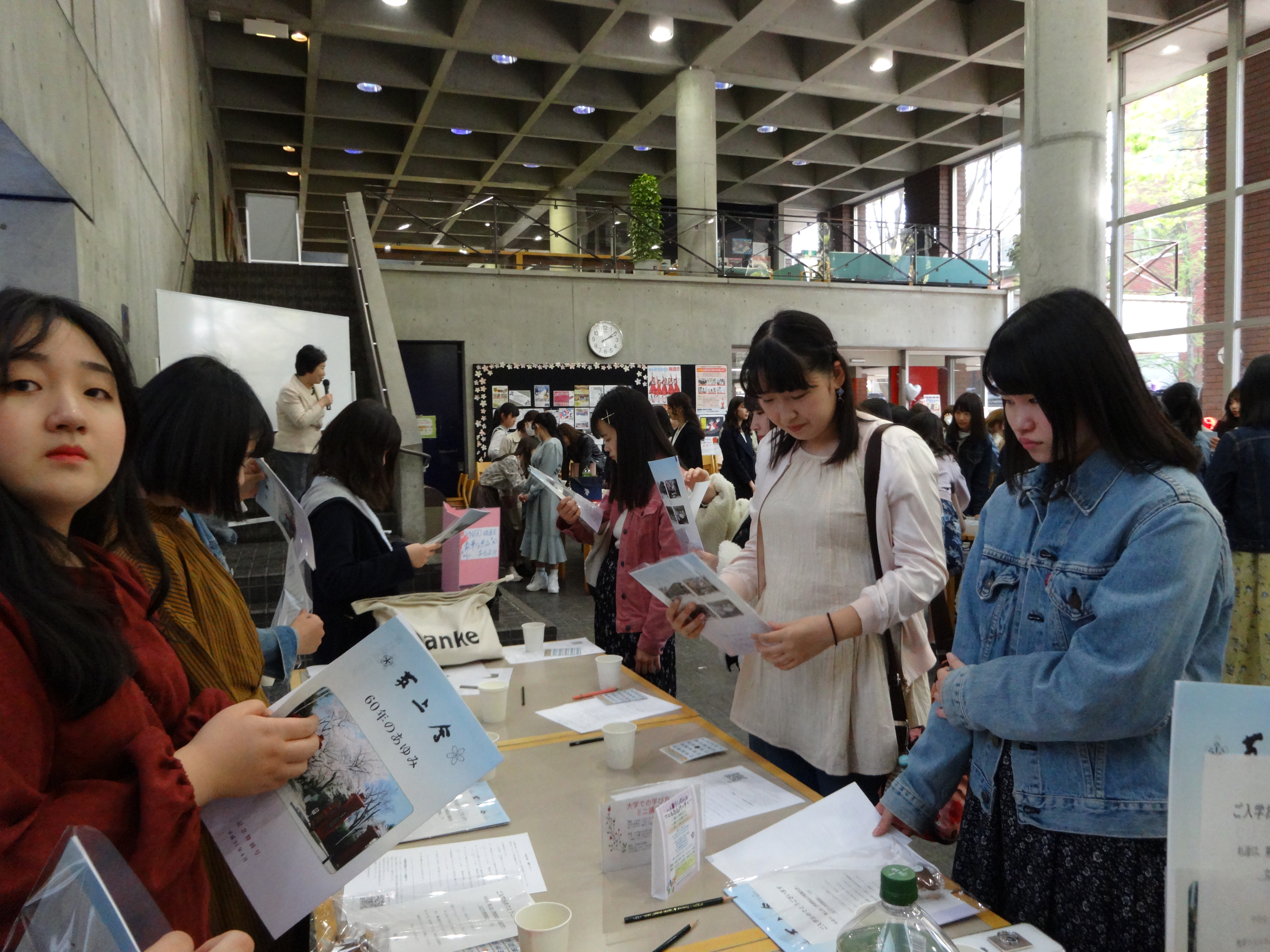 メインホールの各テーブルにお茶を準備して、開始前、入り口に並んだ新入生お一人お一人に、ご入学おめでとう!のチラシ、「草上会60年のあゆみ」と、新宿区社会福祉協議会関連のクッキーをお手渡ししてお祝いしました。その後、新入生の皆さんに草上会の活動について説明をさせていただきました。会場に集まった皆さんは、「草上会60年のあゆみ」を手にしながら熱心に話を聞いて下さいました。
