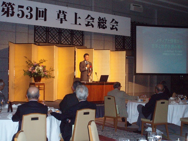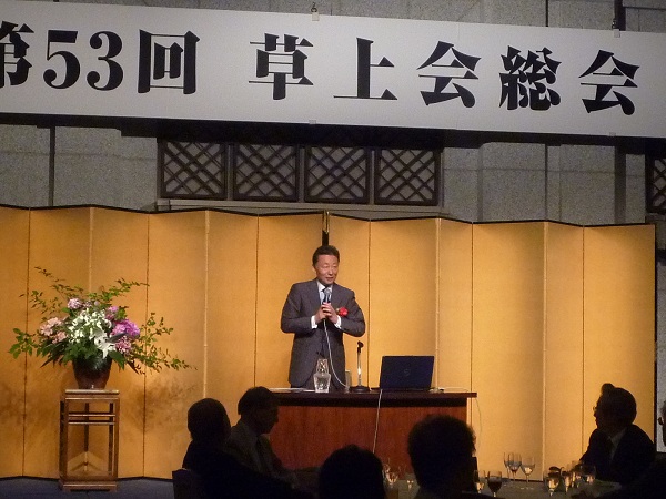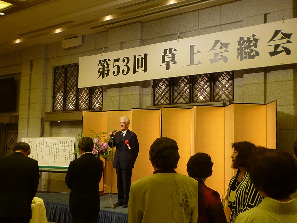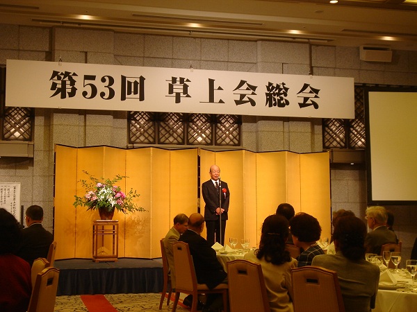 午前中の総会は塚本新会長の挨拶に始まり、新体制の運営委員紹介、平成22年度の活動報告、決算および監査報告、平成23年度の活動予定と予算案が承認されました。続いて会則改定と「草上会会長、副会長および運営委員選出規定」の改定の件が承認されました。