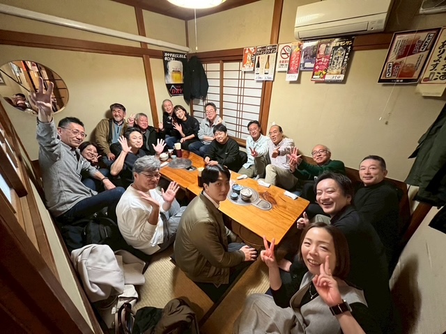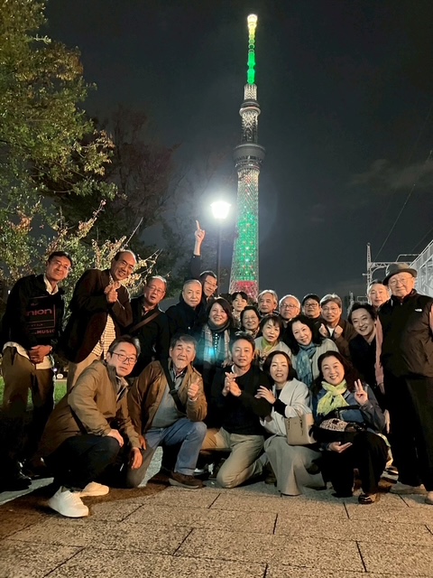 見学後、両国国技館近くの乗船場より、東京水辺ライン(両国~浅草)乗船。2階デッキにて心地よい風を感じながら景色を堪能していると、「橋げたが低いので、皆さんしゃがんでください」とアナウンスがあり頭上すれすれの橋げたを通り抜け、そこには、アサヒビールの象徴のあの金のモニュメントとスカイツリーのお出迎え。さらにすみだリバーウォークを渡橋してLAND_A(東京ミズマチ内カフェ)でお楽しみの懇親会のはじまり。その後ライトアップされたスカイツリー前で記念撮影。美しすぎる…。その後は有志にて2次会へ突入。10人用個室に18人で入店し、昔話とお酒が尽きることなく時間が過ぎていき、途中でお店の方もこの部屋に18人入店し飲み会ができていることに驚いていました。観研らしく無駄のないスケジュール・無駄のない空間の利用で質の濃いイベントになりました。