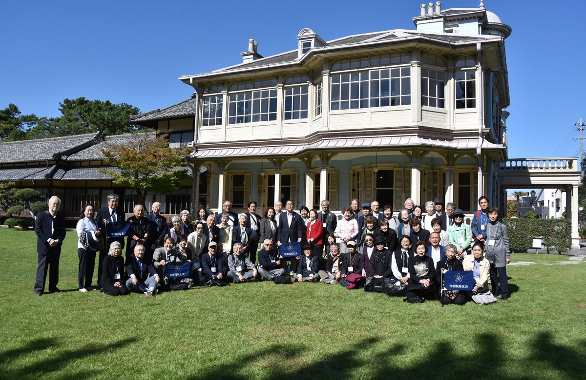 【1日目】JR名古屋駅集合。参加者58名の貸切バスにて名古屋城・徳川美術館訪問。その後ガーデンレストラン徳川園にて、東海桜友会の水谷会長はじめ支部の方々との懇親会を催行。