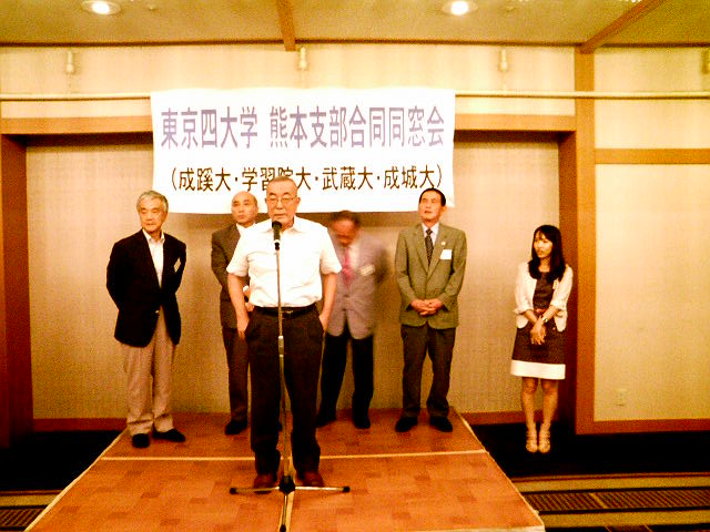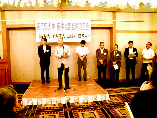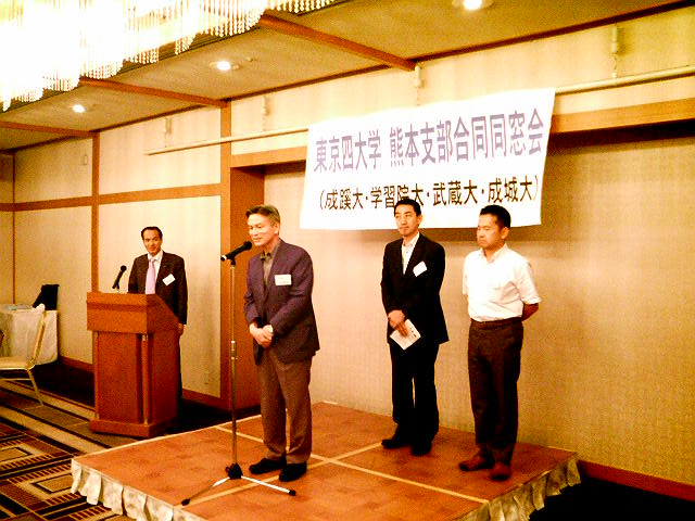 7月23日(土)18時よりKKRホテル熊本1F天草の間において、第2回東京四大学熊本支部合同同窓会が開催され、計40名近くの参加がありました。東京四大学とは旧制高校の流れをくむ学習院・成蹊・成城・武蔵の各大学からなり、現在も四大学対抗の体育会の競技大会が開かれています。四大学は校風も似通り、大学間を越えて互いに知己も多いことから、昨年より合同の同窓会を始めました。