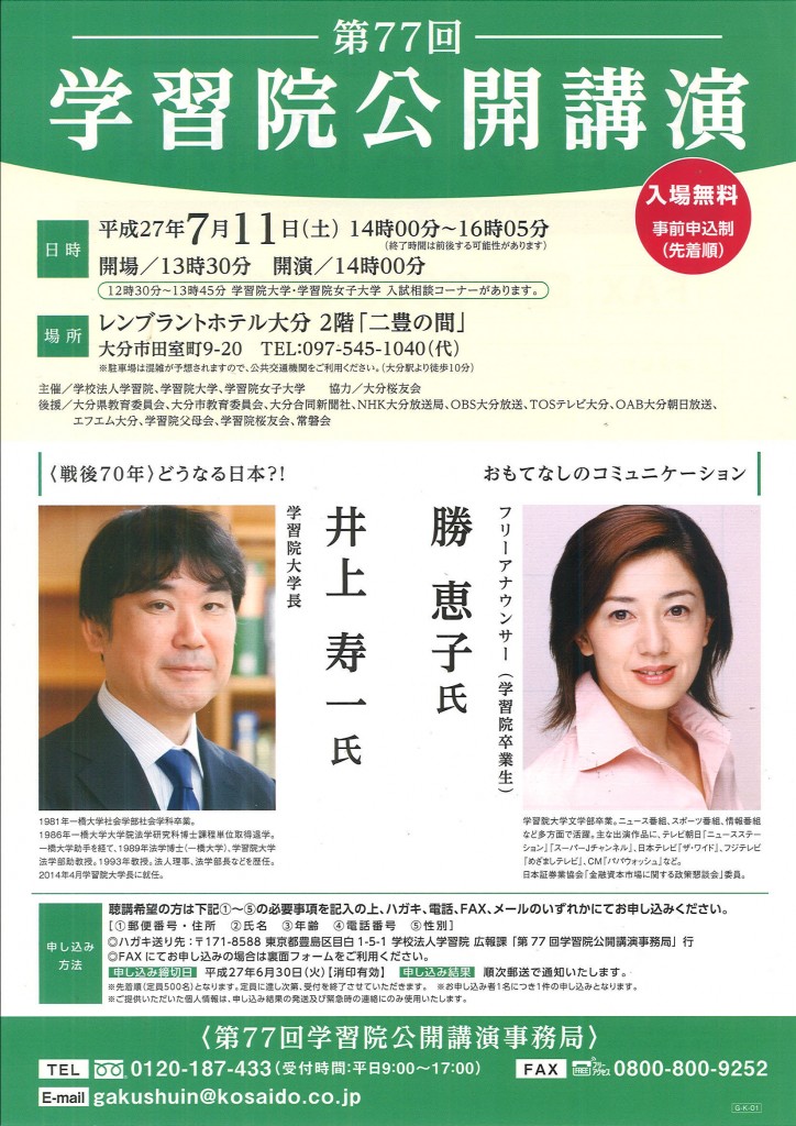 第77回 学習院公開講演が、7月11日(土)レンブラントホテル大分にて開催されることが決定され、配布されるチラシも完成しました。