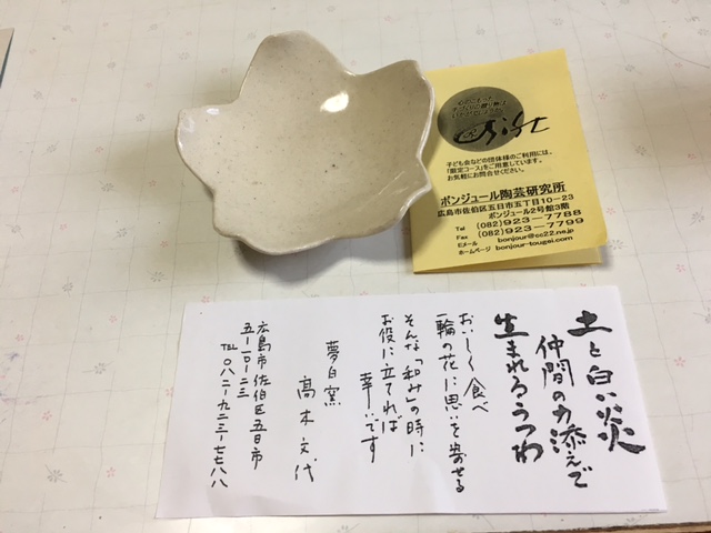 2017.09.25 全国支部:広島桜友会 「初秋の旬の料理を楽しむ会」が開催されました。2017. 9.24 9月24日 吉川修平氏(昭和37年経済卒)の営まれる「旬魚 きっ川」で「初秋の旬の料理を楽しむ会」を開きました。 この会に合わせて陶芸家の高木文代さん(昭和50年英文卒)が用意された作品を器として料理をいただきました。 酒はもちろん学習院の酒「櫻朶」です。次々に瓶が空になり用意した「櫻朶」はすべてなくなりました。 大変な盛り上がりようでした。 帰りには吉川さんからお店で使われている新米を、高木さんからは学習院をイメージして作陶された桜の形の小皿を おみやげに頂き、ご機嫌で家路につきました。 広島桜友会 世話役 戸田 武弘