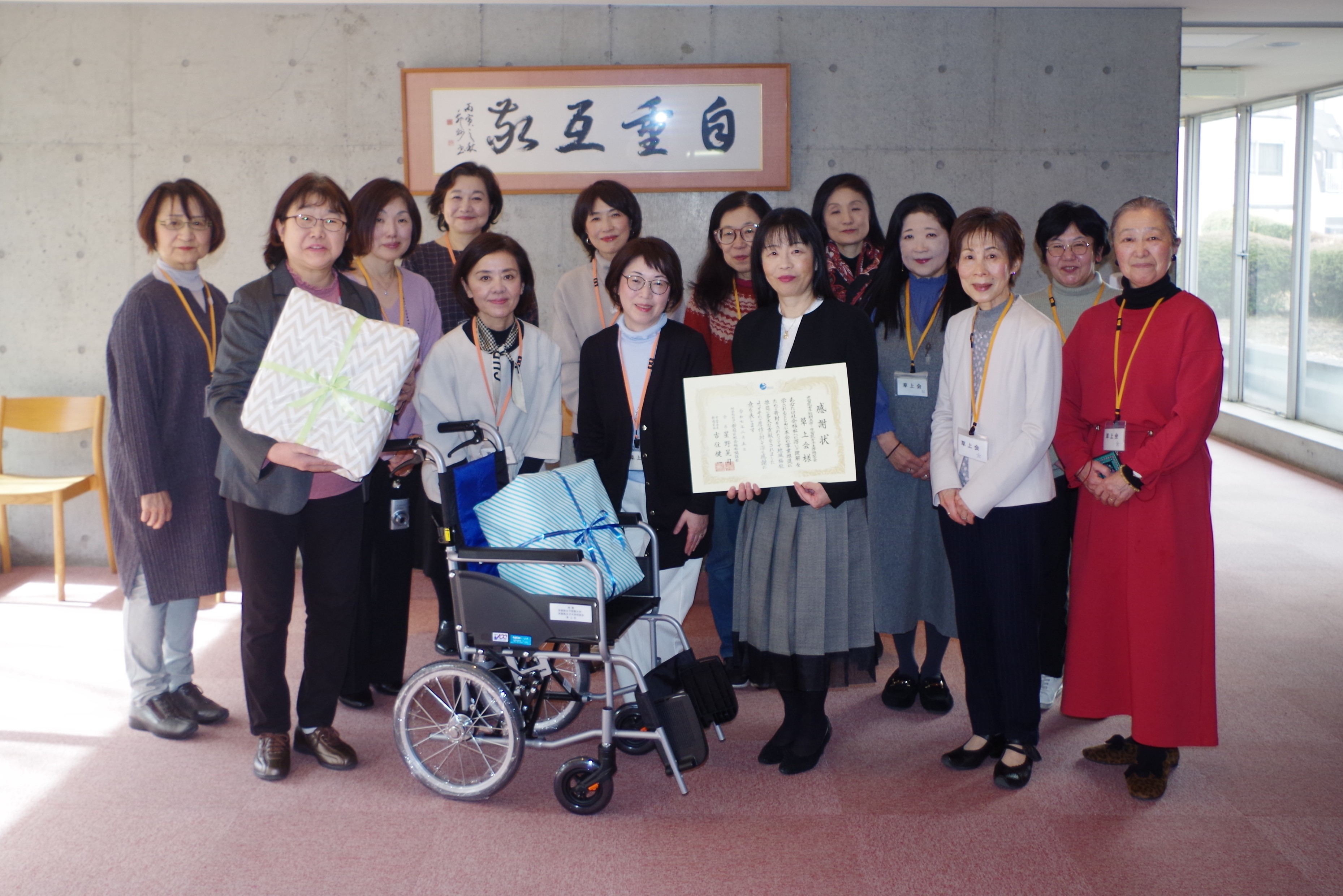 令和7年2月5日(水)、互敬会館3階にて新宿区社会福祉協議会から3名の方をお迎えし贈呈式が行われました。今年度は和祭バザーの収益より車椅子3台と、毎月のボランティア活動で作製したフキン200枚を寄贈し、感謝状をいただきました。車椅子は必要とされる方への貸し出し用に、フキンは区内の高齢者グループ、子ども食堂、女性支援施設等で活用していただいているとのことでした。