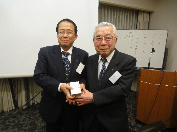上中啓五郎氏から講師・岡田正明氏(左側)へ記念品の贈呈