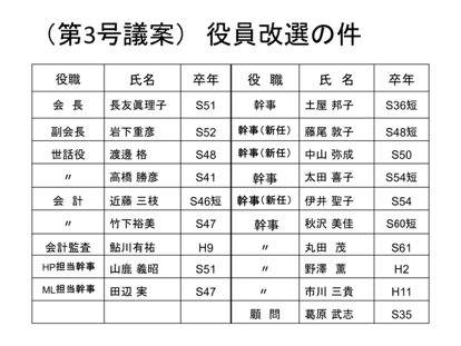2015.11.23 全国支部:調布・狛江桜友会 役員紹介 aaf317a6a4626c075831ac4842e26831-1 2023年7月2日に開催された第17回総会での資料です。この役員名簿(最終の完成版)が最新の役員名簿になります。(2024年は、役員改選がありませんでしたので…) aaf317a6a4626c075831ac4842e26831-3