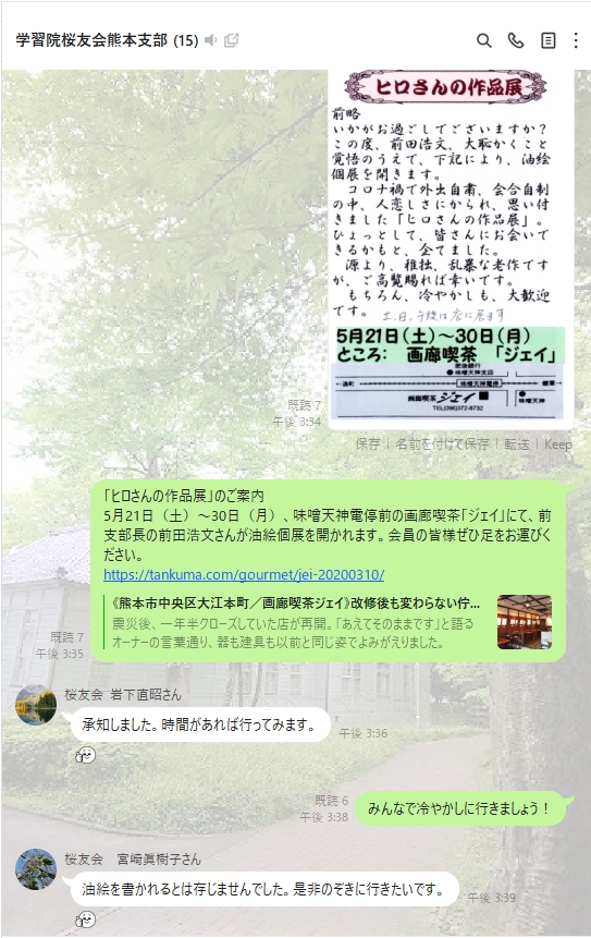 コロナ禍の影響で桜友会活動が制約され、会員の近況を知る機会が激減しています。令和4年度の支部総会についてもまだ開催の計画すら組めない状況が続いています。そこで、対面での交流に代替する手段として熊本支部のLINEグループを創設することにしました。