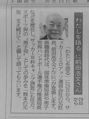 折しも5月29日から約1か月間にわたって前田浩文さんの自伝インタビュー「わたしを語る」が、地元紙の熊本日日新聞において掲載されます(写真:同紙5月27日1面掲載の予告)。対面での会員交流事業が制約されているため、こうした情報を会員へお知らせするためにも、先月末に創設した支部LINEグループへの会員参加を世話役より呼び掛けていくこととします。