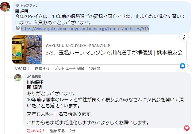 3月5日は、学習院大学OBのランナー・川内優輝選手の36歳の誕生日にあたり、当日は玉名市の第74回金栗杯玉名ハーフマラソンに出場したことを、昨日(3月6日)本人のfacebookで報告投稿していました。それで、驚くのは10年前の自身の記録から11秒切る5位入賞を果たしたとのことです。さらに投稿を読むと、川内選手の玉名ハーフに対する評価がかなり高いことも分かります。