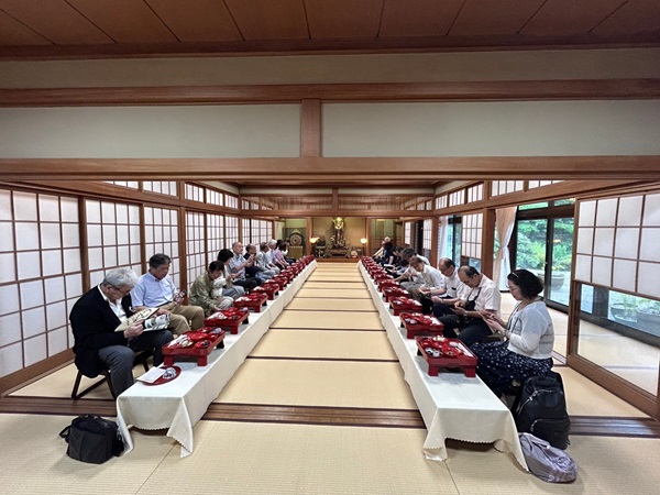 2024.06.30 全国支部:湘南桜友会 第2回美食の会開催 令和6年6月28日、24名のご参加を頂き、第2回美食の会を開催致しました。鎌倉の材木座にある、天照山光明寺を拝観し、精進料理を頂いた後、ご住職より法話を伺いました。生憎の雨ではありましたが、しっとりとした雰囲気の中、普段は見られない仏像を見せていただいたり、有難いお話を伺うことが出来ました。外を見学する時に、ひどい降りだった雨が止み、「延命地蔵」、内藤家墓所にお参りすることが出来ました。内藤家墓所には、ご一族の百基以上のお墓があり、これほど大規模な大名のお墓がまとまっていることは珍しいとのこと、歴史を感じる場所でした。