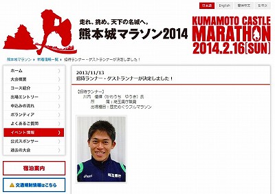本学卒業生の市民ランナー・川内優輝選手が、福岡国際(2013/12/1)、熊本城(2014/2/16