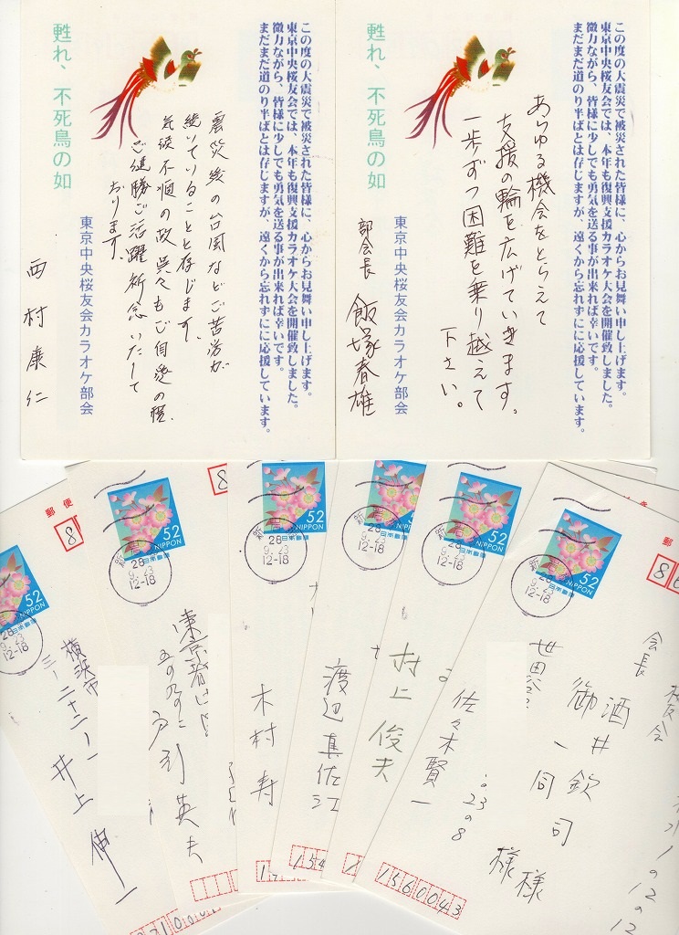 東京中央桜友会カラオケ部会の皆様から先月(9月)も多数励ましのハガキを頂戴しましたので、ご紹介いたし
