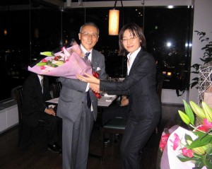 花束を受ける長 雄二氏花束を受ける鍋谷 汎氏 恒例の新年会が1月18日の夕刻から県庁15階のレスト