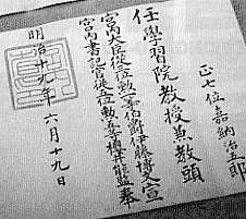 嘉納治五郎師範の辞令。明治19年に学習院の教授兼教頭になった時のもの学習院の柔道の歴史は、講道館の創